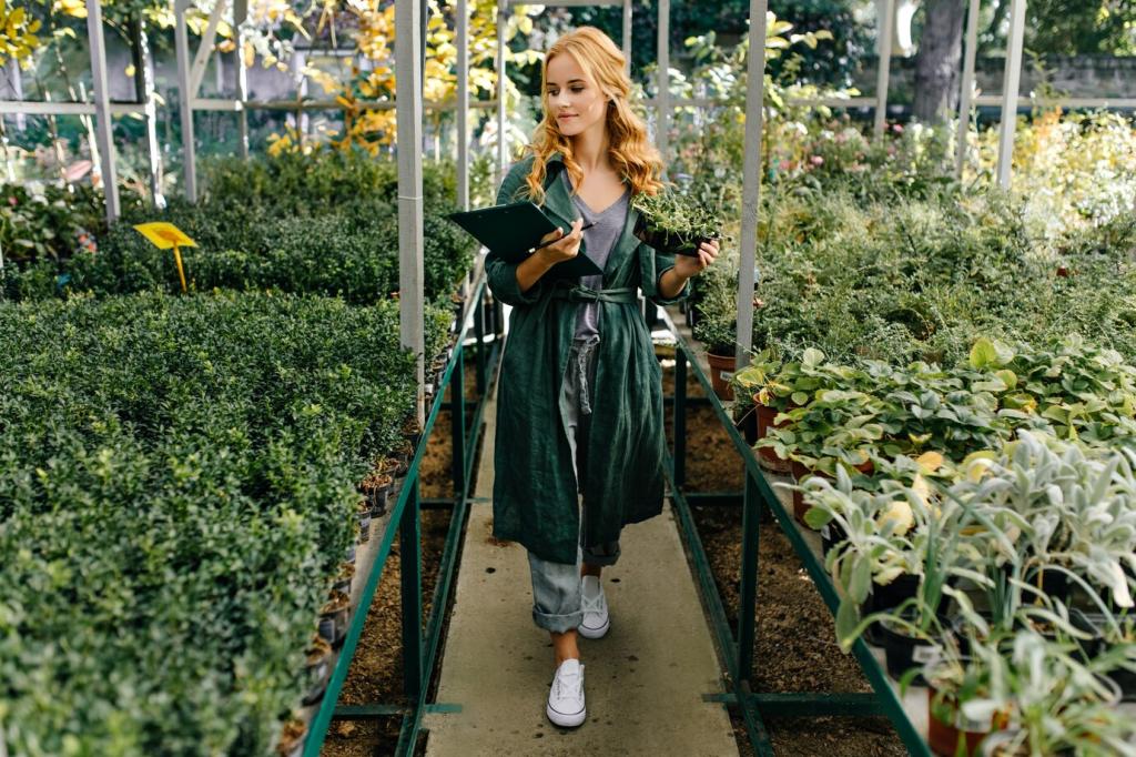 Sensores de humedad y termómetros infrarrojos ayudan a ajustar riego y detectar zonas calientes. Con unos pocos datos periódicos, optimizas consumo y mantienes las plantas vigorosas. ¿Te compartimos una hoja de control?